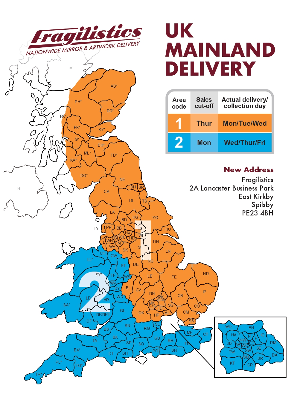We use a specialist carrier called Fragilistics to fulfill our deliveries. They service the UK Mainland and Northern Ireland every week by fulfilling to certain areas on set days every week. Below you will find a map broken down into the postcode areas within the UK, the delivery area that they fall into and, the dedicated delivery schedule for that area.
